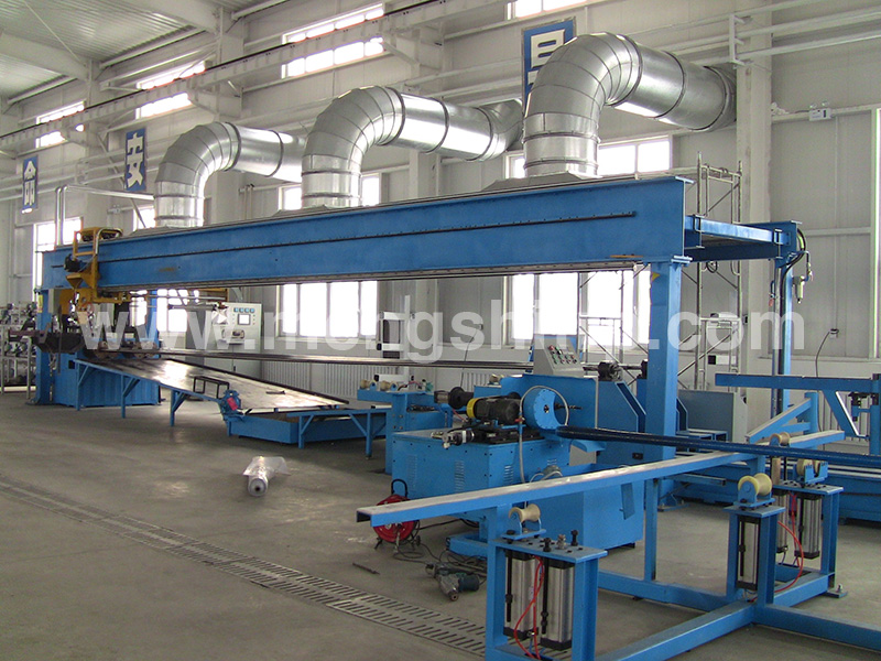 一、該設(shè)備由一條二工位或者4工位微機(jī)控制纏繞機(jī)組、鋼制管模具蒸汽內(nèi)加熱及水冷脫模自控系統(tǒng)、以及輔助設(shè)備等組成??缮a(chǎn)管徑為2"~28"(DN50~DN700),單根管長(zhǎng)9.15或12m。生產(chǎn)線設(shè)計(jì)年產(chǎn)量180 km(以2"管、工作壓力7MPa,每天16小時(shí)工作,每年按300天計(jì)算)。